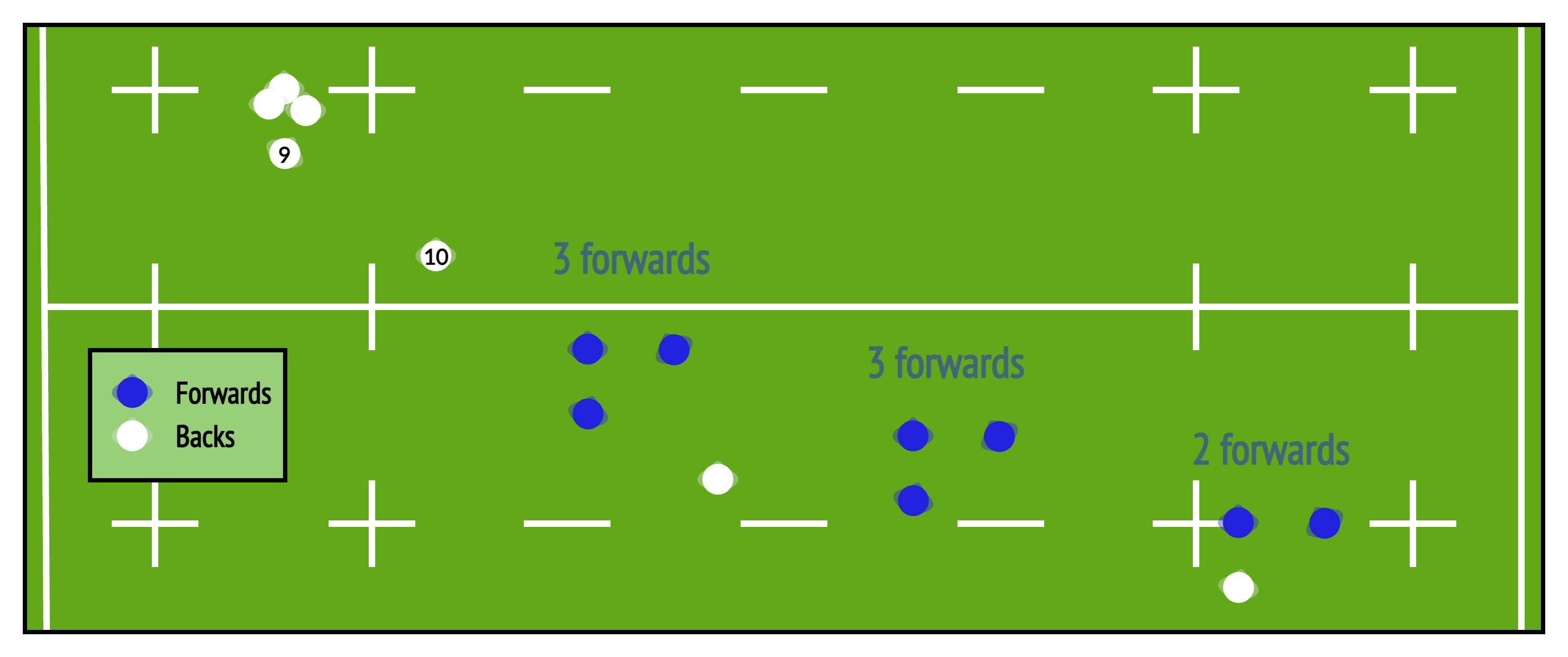 Expect the backs to play to an edge and the forwards form pods of 3 spread across the pitch. The 2-pod (usually on the opposite edge) requires a back to fill in the support role at the back of the pod.