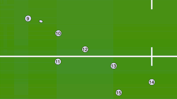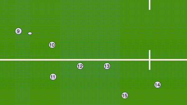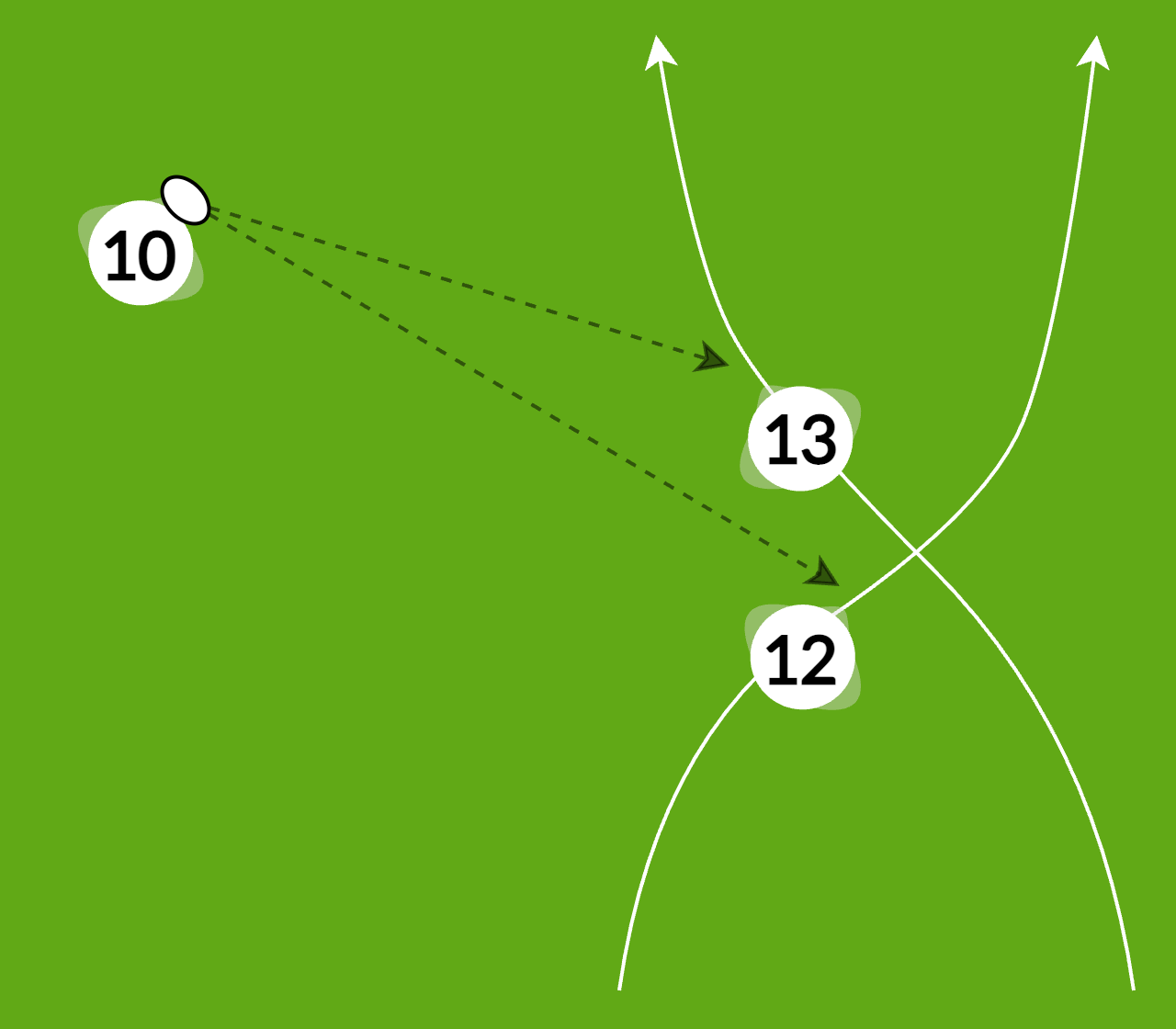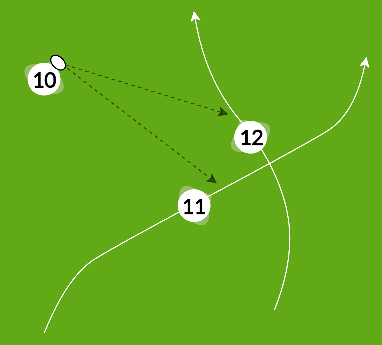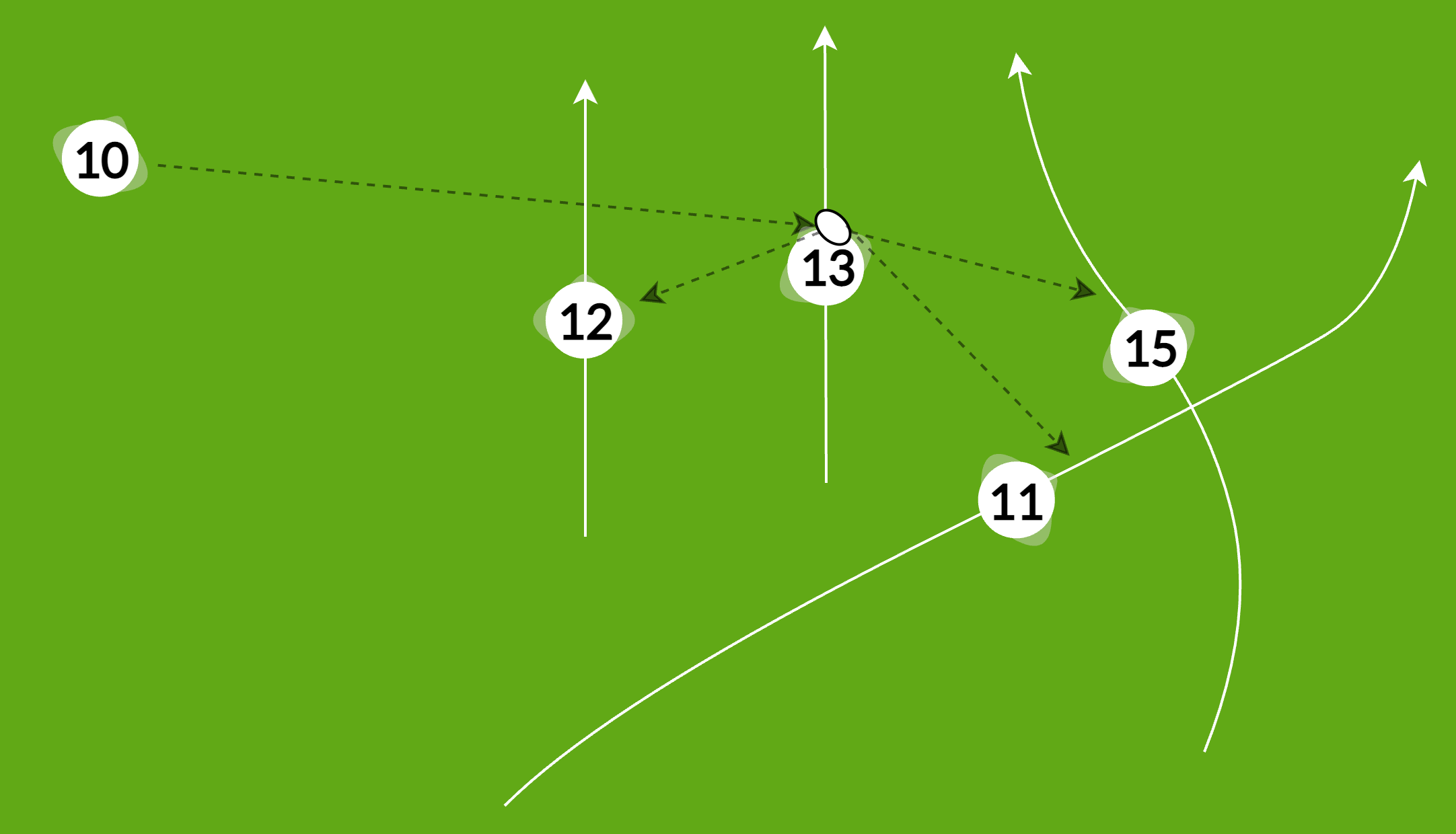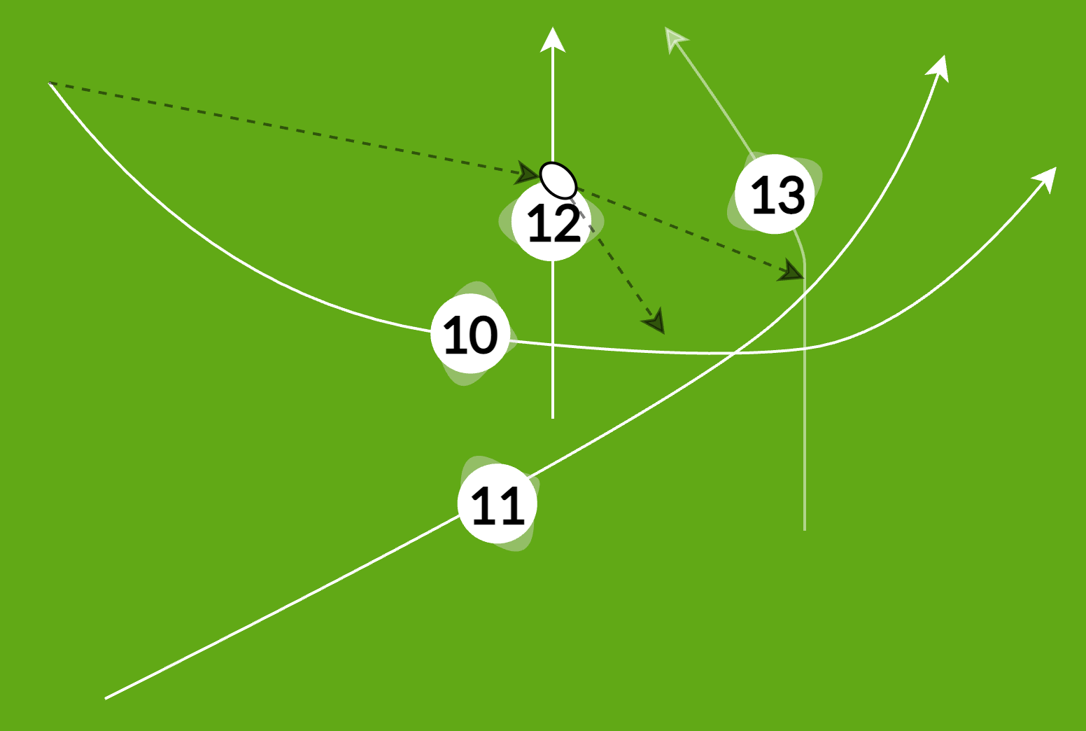 - 10 sits deep as 12 and 13 run through, with 12 taking the ball