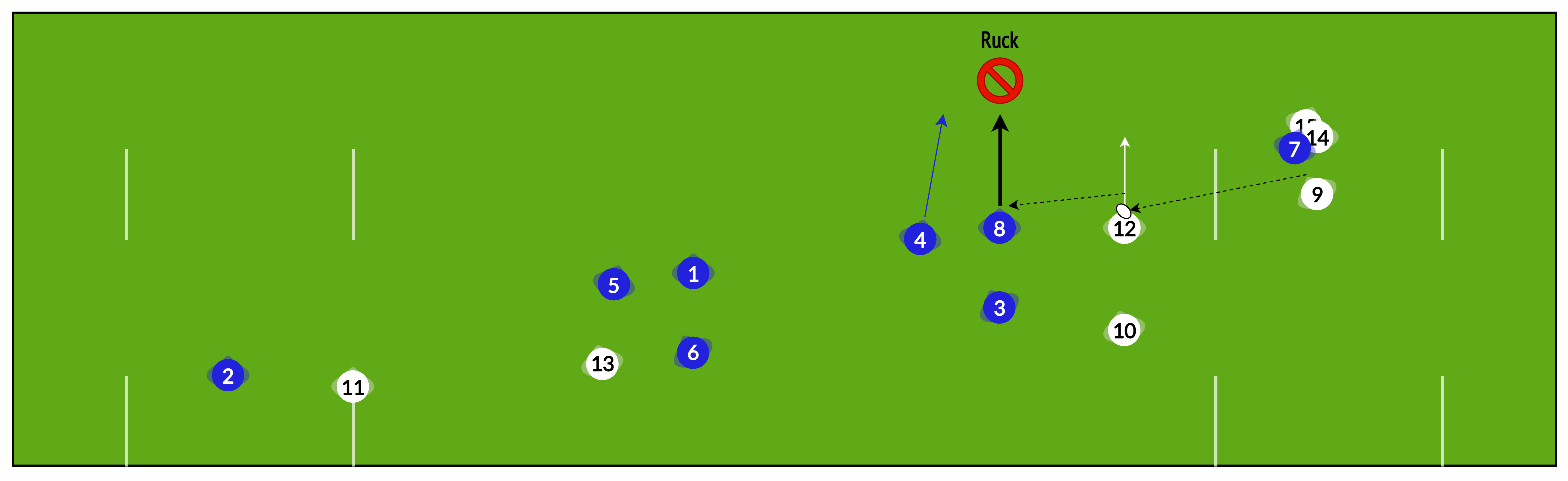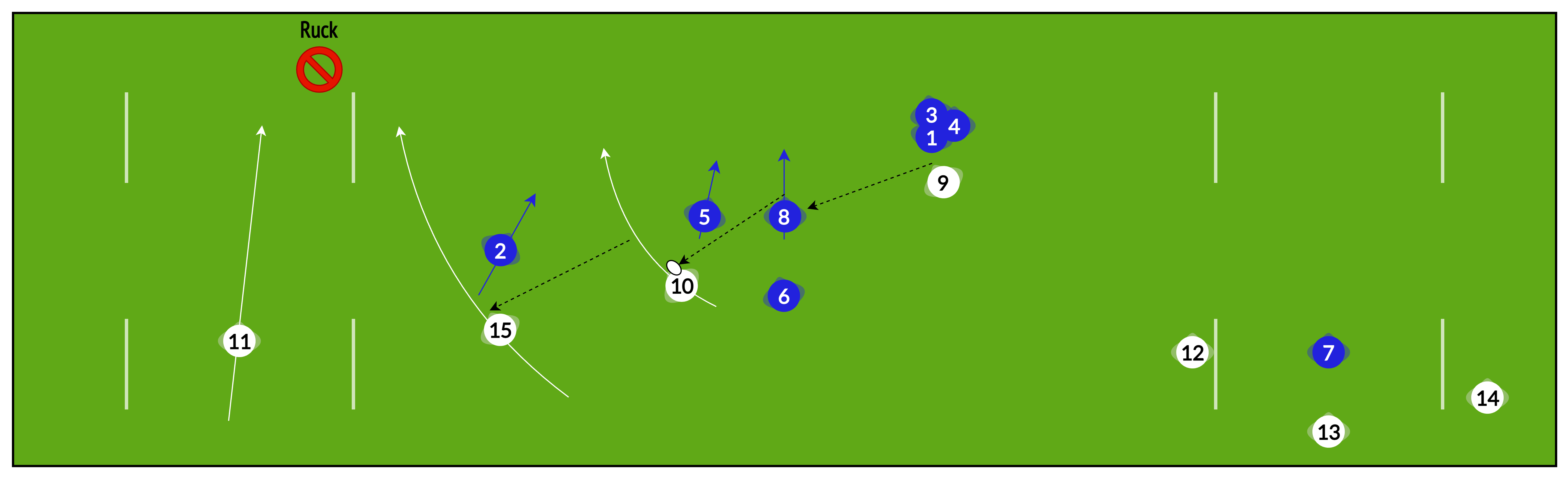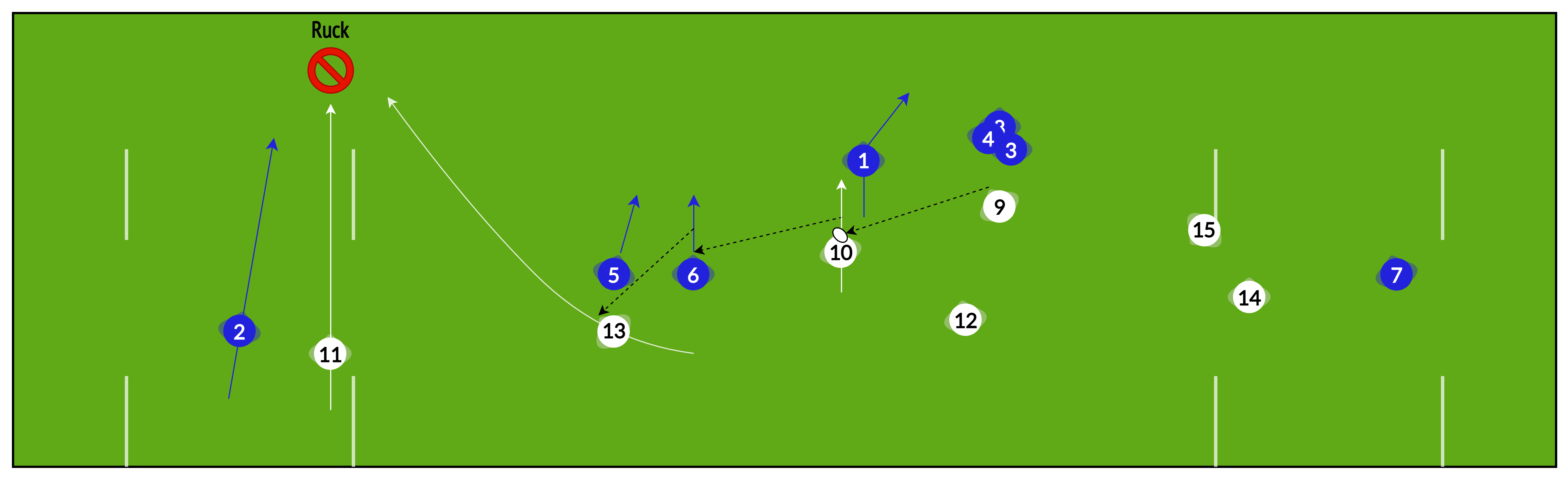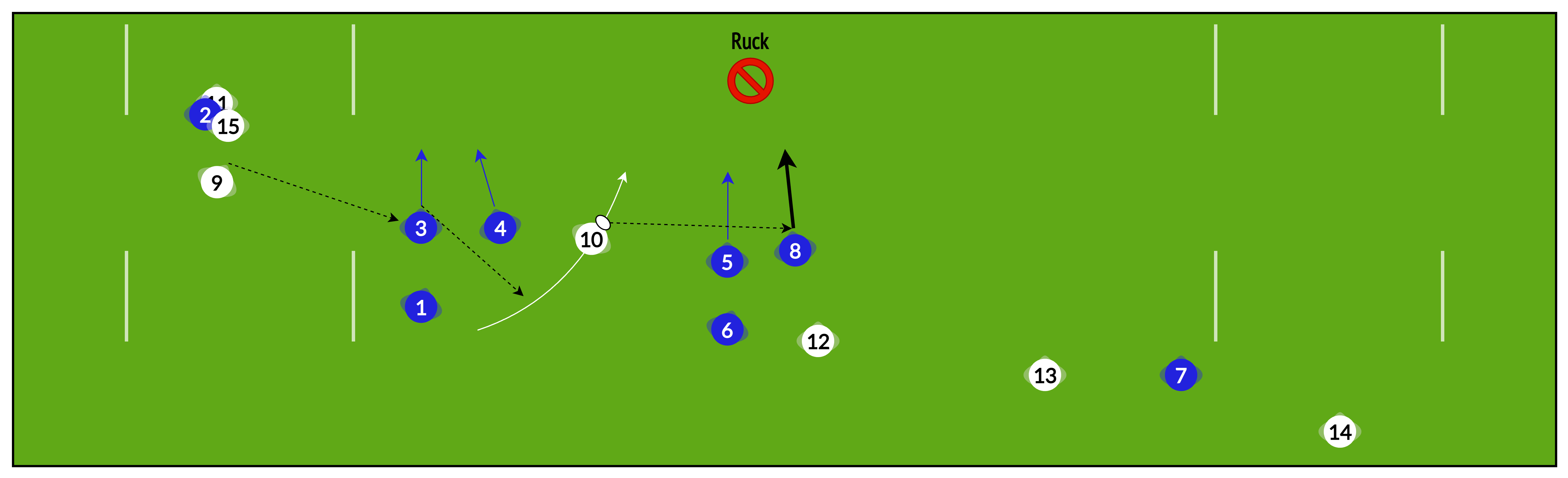 Rather than playing “heads up” from phase to phase, sometimes it is useful to have several phases pre-planned to help re-establish our attacking shape and break down a well-organised defence.