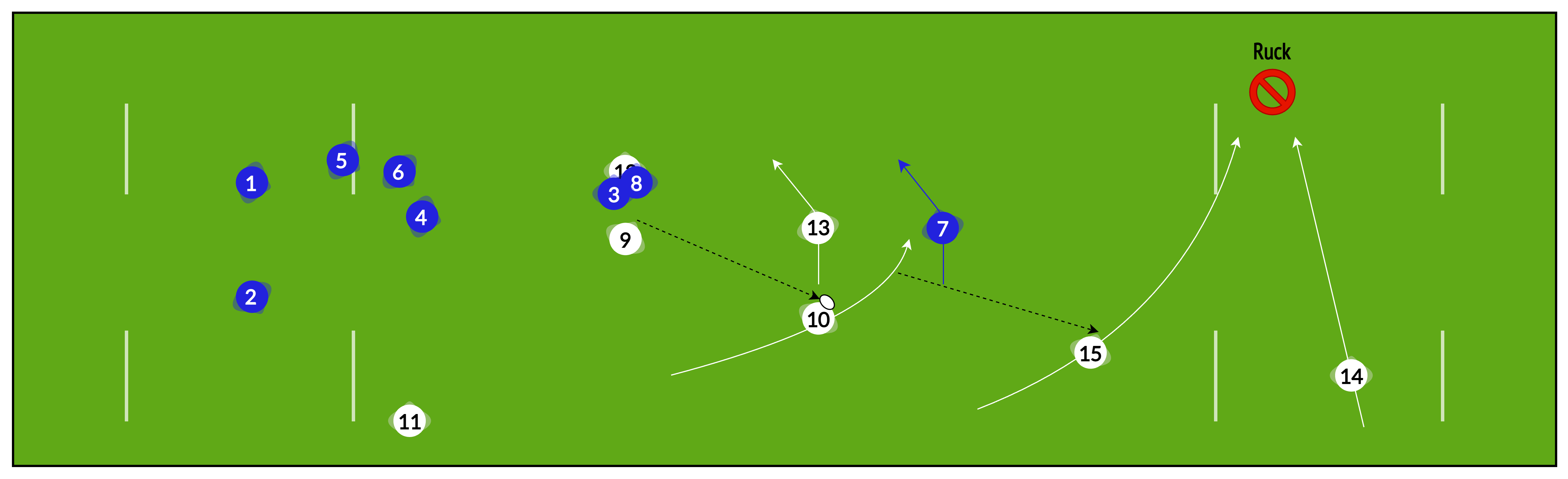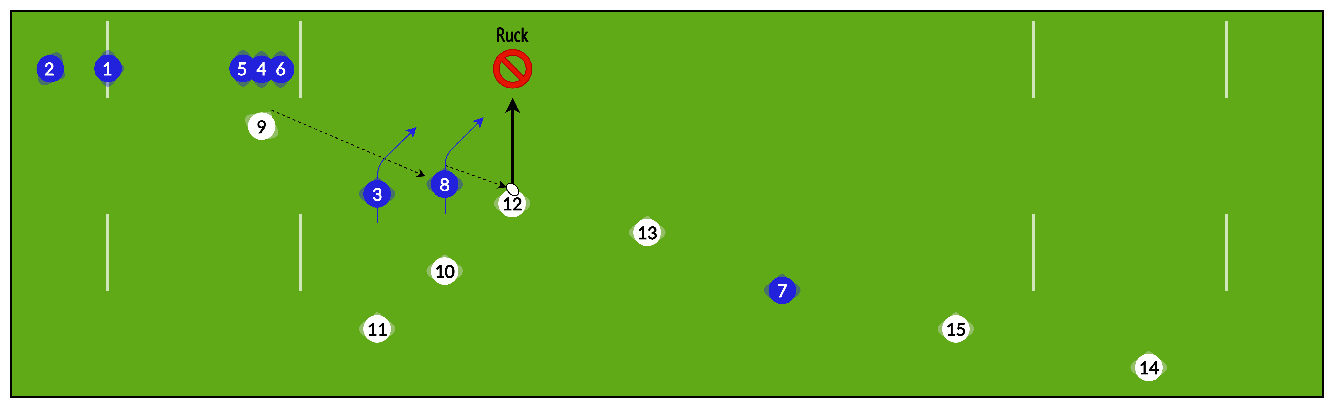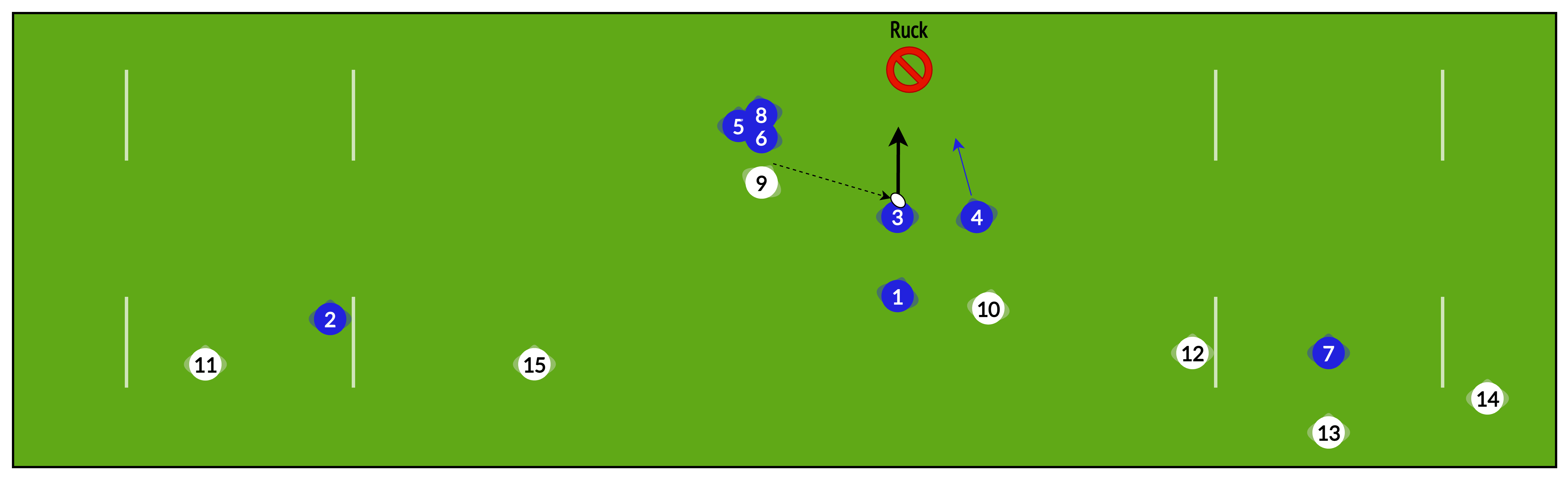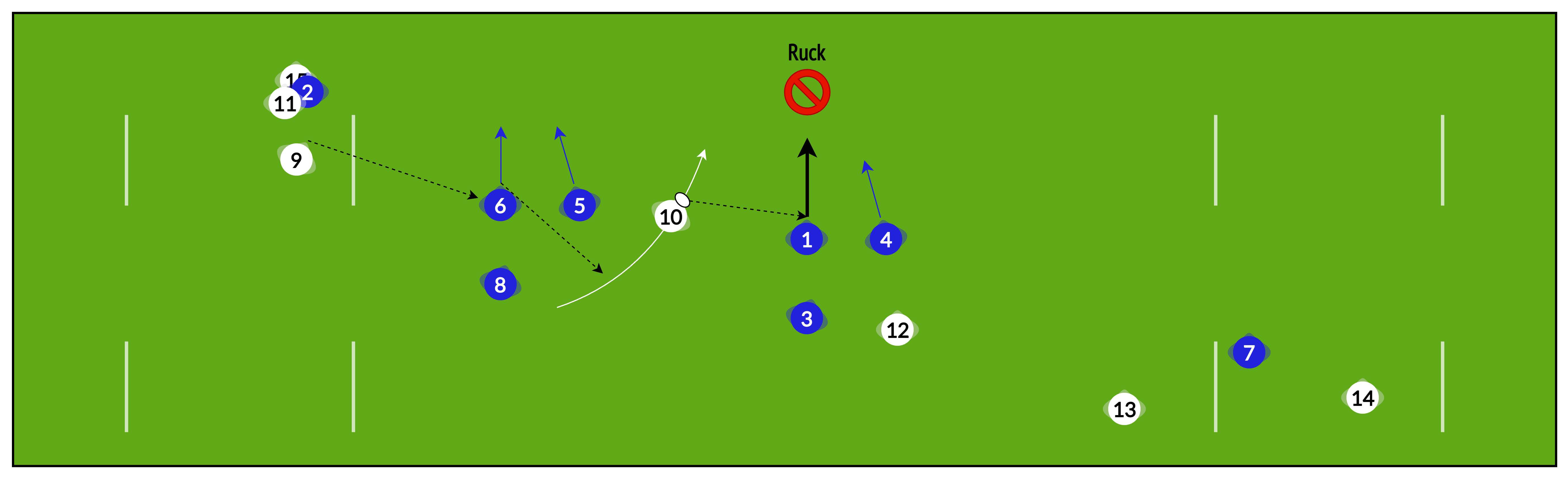 Rather than playing “heads up” from phase to phase, sometimes it is useful to have several phases pre-planned to help re-establish our attacking shape and break down a well-organised defence.