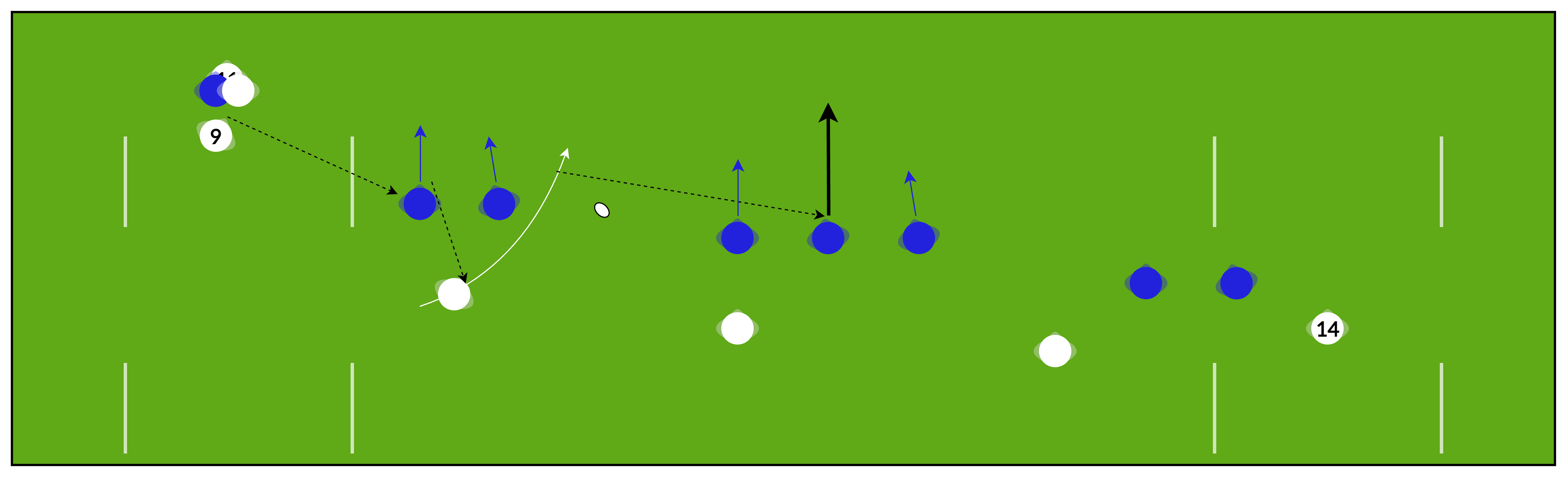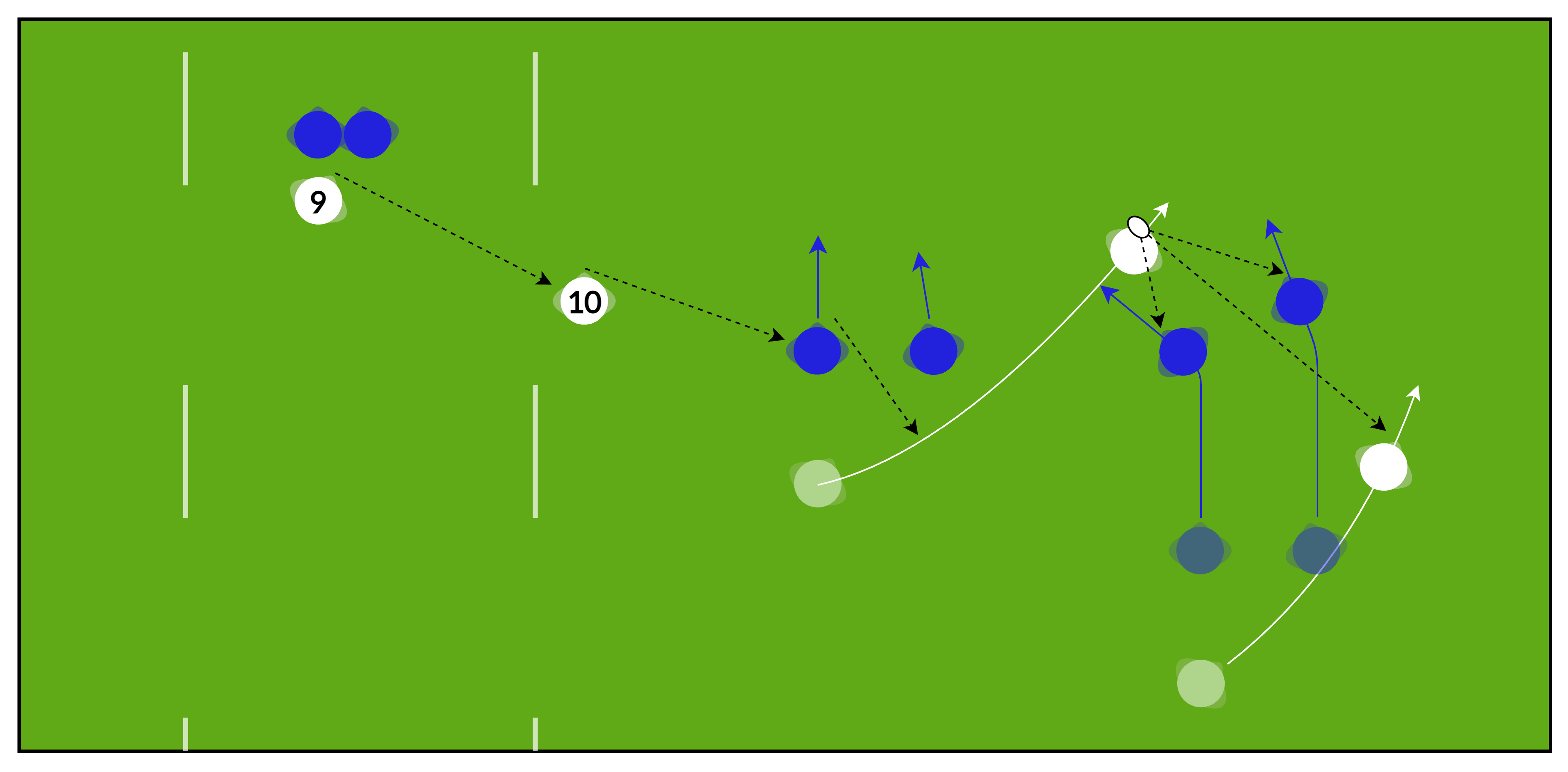Rather than playing “heads up” from phase to phase, sometimes it is useful to have one or several phases pre-planned to help re-establish our attacking shape and break down a well-organised defence.