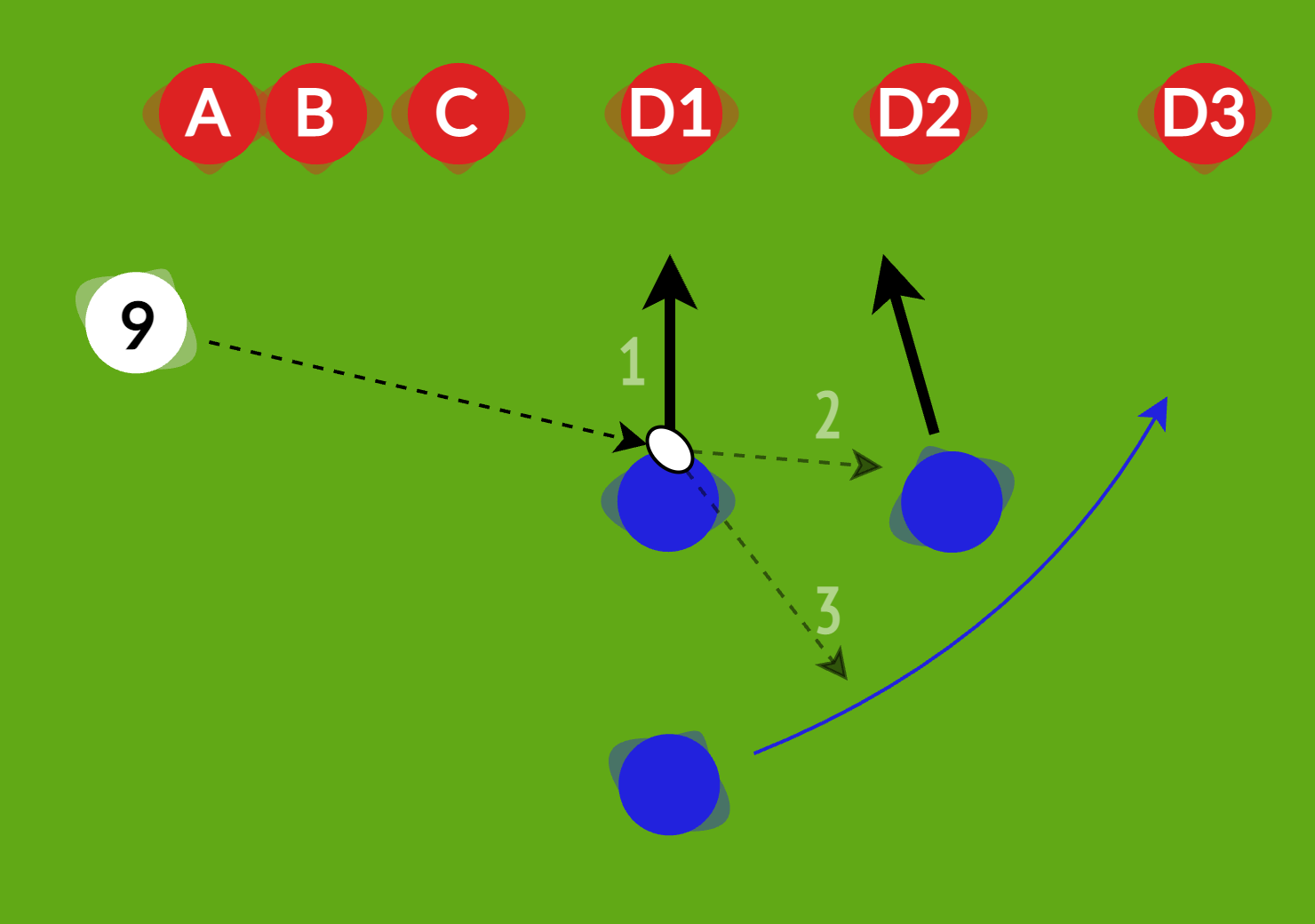 Lead takes the ball at pace off 9, aiming outside the C defender.