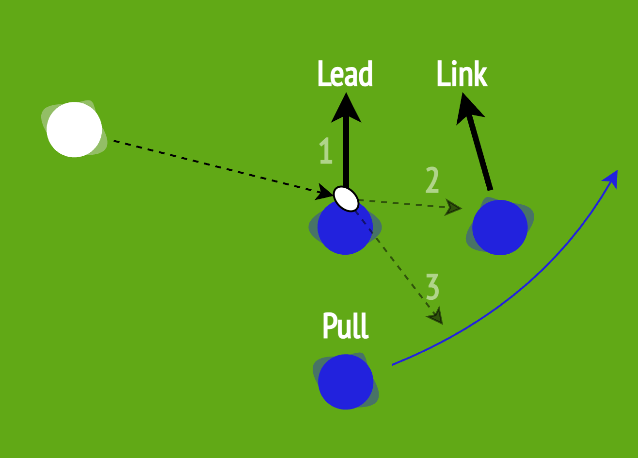 - “Pull” sits behind “Lead” tracking across to support either ball carrier or to take a pull back pass